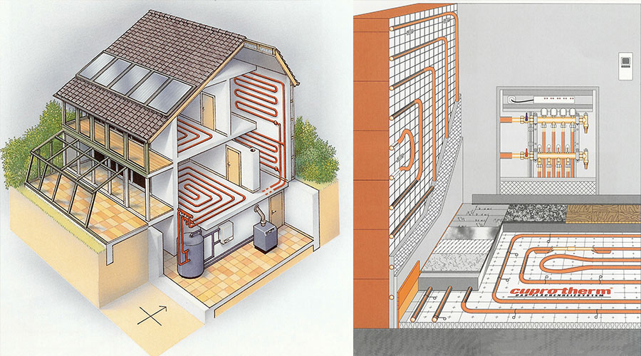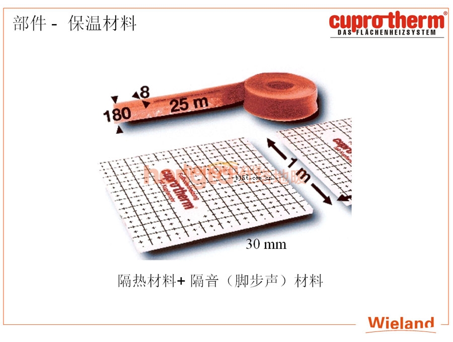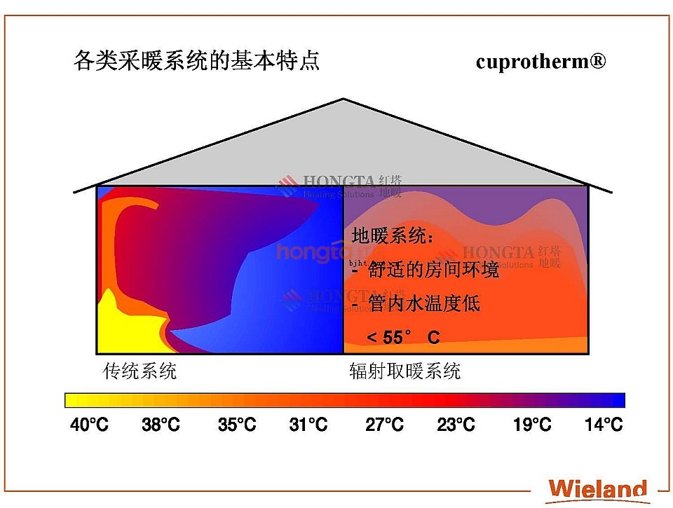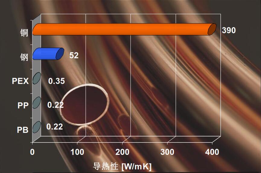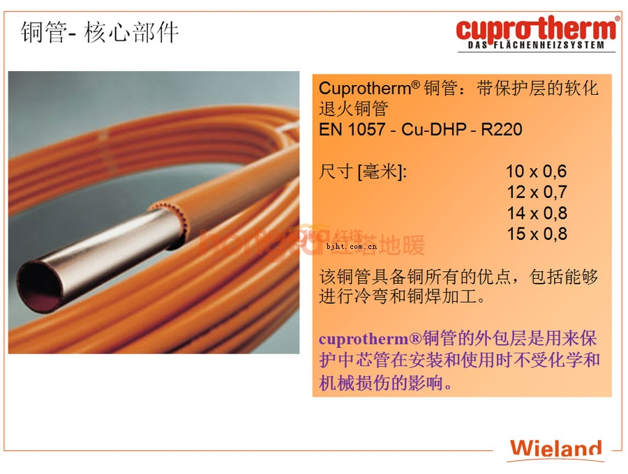 cuprotherm® 管由紫銅管組成。銅在所有建筑材 料中導(dǎo)熱性優(yōu)異,比非金屬地暖管材的 導(dǎo)熱性要好N倍。連同混凝土及覆地物等可獲得的總體熱通量要比標(biāo)準(zhǔn)地暖系統(tǒng)高10%。