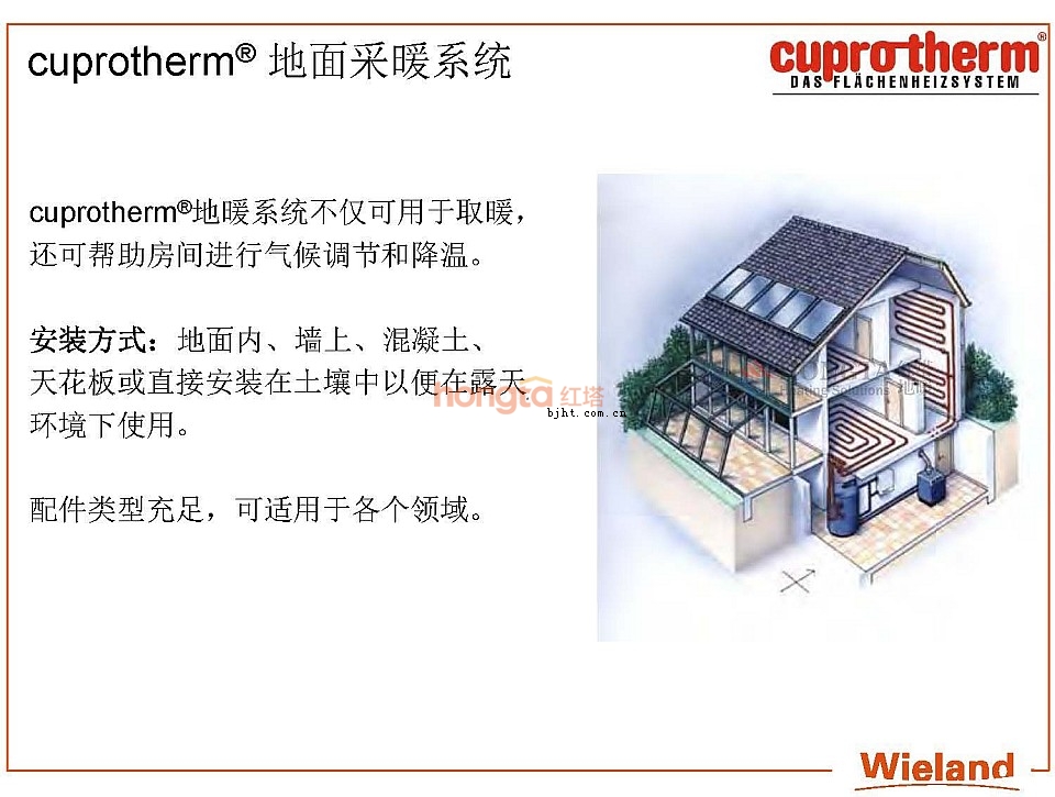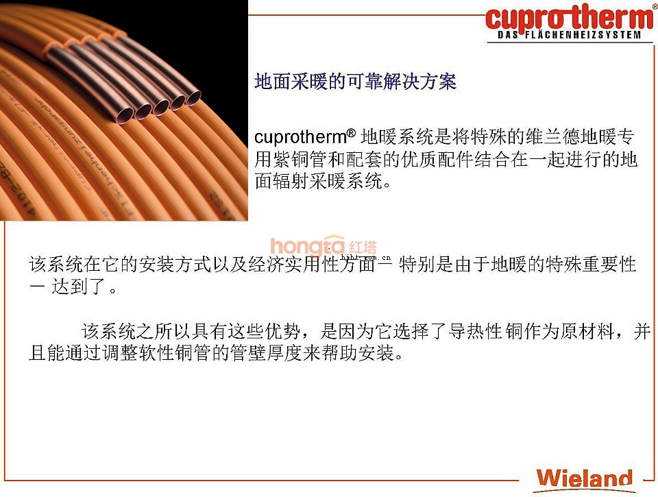 維蘭德公司是國際知名生產(chǎn)商,產(chǎn)品包括由紫銅和紫銅合金制成的帶、板、管、棒、線以及其它形式的半制成品。我們同時還生產(chǎn)熱交換器配套的滑動軸承和翅管。 長期以來,紫銅以其突出的特點和屬性成為國際廣泛使用的金屬之一。它的應(yīng)用領(lǐng)域包括水和取暖系統(tǒng),以及機械、光學(xué)、制幣、汽車、電氣、電子等行業(yè)。維蘭德集團下?lián)碛斜椴既虻闹圃旃尽⒓舨眉庸ぶ行暮唾Q(mào)易公司。它們靠近客戶,不僅為客戶節(jié)省了運送時間,同時還提供了高水準(zhǔn)的服務(wù)。 德國維蘭德集團(Wieland Group)已經(jīng)擁有43家遍布在全球各地的生產(chǎn)部門、服務(wù)中心和子公司。 年銷售額約 12億歐元,員工人數(shù)約 5600人,產(chǎn)品銷售數(shù)量約 450000公噸。 Cuprotherm® 紫銅管熱水地暖系統(tǒng)是維蘭德旗下重要的品牌,專注于地暖系統(tǒng)的開發(fā)。如今安裝長度已經(jīng)達到1億米,是歐洲知名的銅管地暖系統(tǒng)品牌之一。