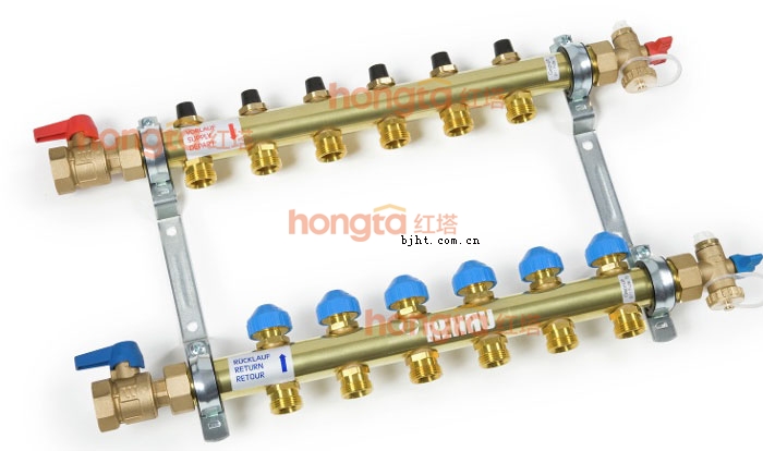 分水器端上部帶有流量調(diào)節(jié)閥(或帶調(diào)節(jié)功能的流量計(jì)),使用相應(yīng)工具,可輕松調(diào)節(jié)每個(gè)支路的水流量;集水器上部為手動(dòng)關(guān)斷閥,可以手動(dòng)關(guān)斷對(duì)應(yīng)回路,亦可選裝電熱執(zhí)行器,與溫控器一起使用,實(shí)現(xiàn)自動(dòng)溫度控制。